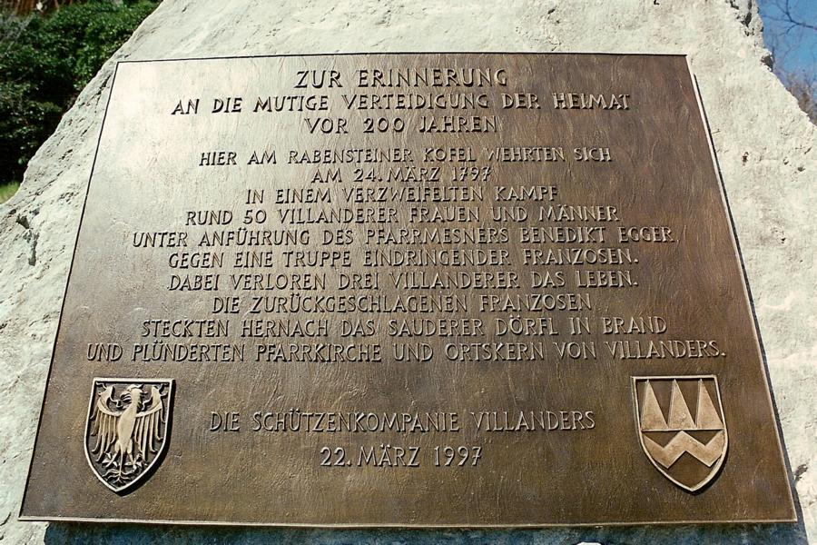 Im März 1997 wurde am "Rabensteiner Kofl" zum Gedenken des Wiederstandes der "tapferen Weiber und Mädchen von Villanders" gegen die Franzosen vor 200 Jahren ein Gedenkstein aufgestellt. Auf den 11.700 kg schweren Stein hängt eine Bronzetafel auf der die Ereignisse aus dem Jahr 1797 schriftlich wiedergegeben werden. Bei der Einweihung durch Pfarrer Anton Mittelberger am 22. März, waren der Bezirksmajor Sepp Kaser mit der Bezirksfahne sowie zahlreiche andere Fahnenabordnungen anwesend. Eine Tafel mit folgendem Text erinnert an die Ereignisse von damals: "Zur Erinnerung an die mutige Verteidigung der Heimat vor 200 Jahren. Hier am Rabensteiner Kofel wehrten sich am 24. März 1797 in einem verzweifelten Kampf 50 Villanderer Frauen und Männer unter Anführung des Pfarrmesners Benedikt Egger gegen eine Truppe eindringender Franzosen. Dabei verloren drei Villanderer das Leben. Die zurückgeschlagenen Franzosen steckten hernach das Dörfl in Brand und plünderten Pfarrkirche und Ortskern von Villanders."