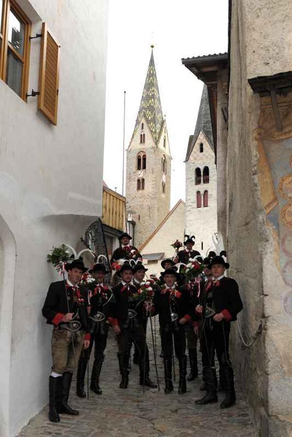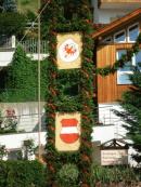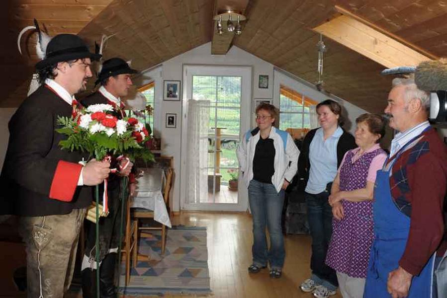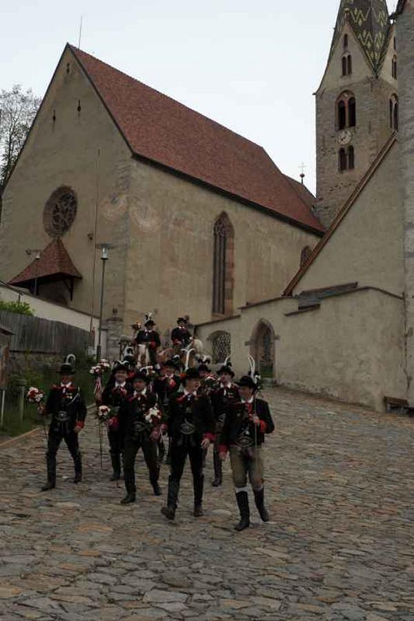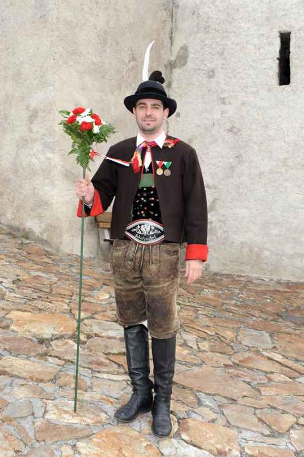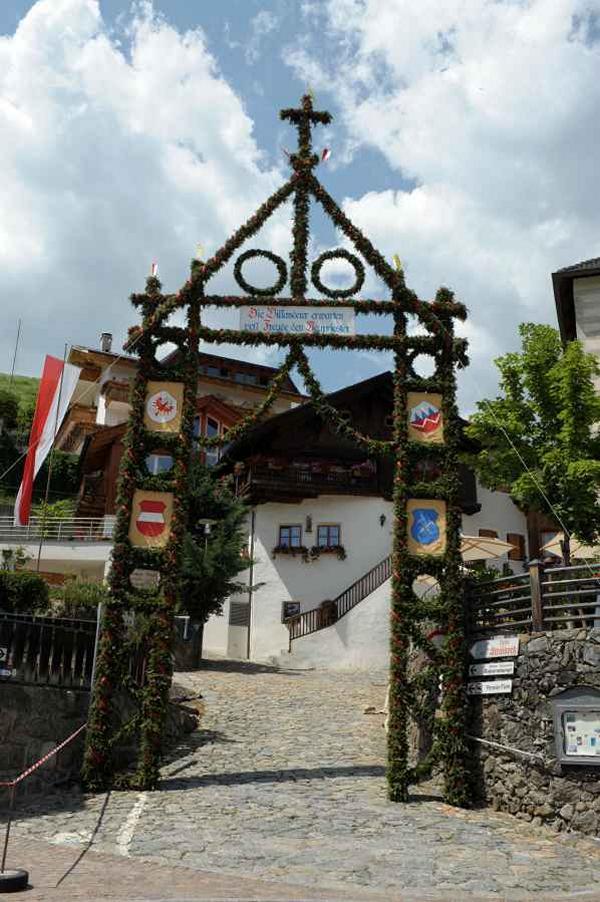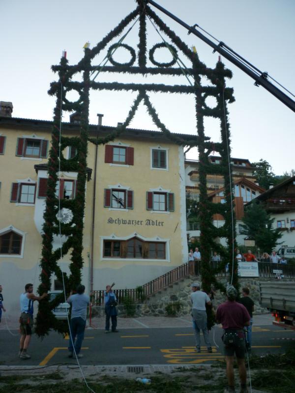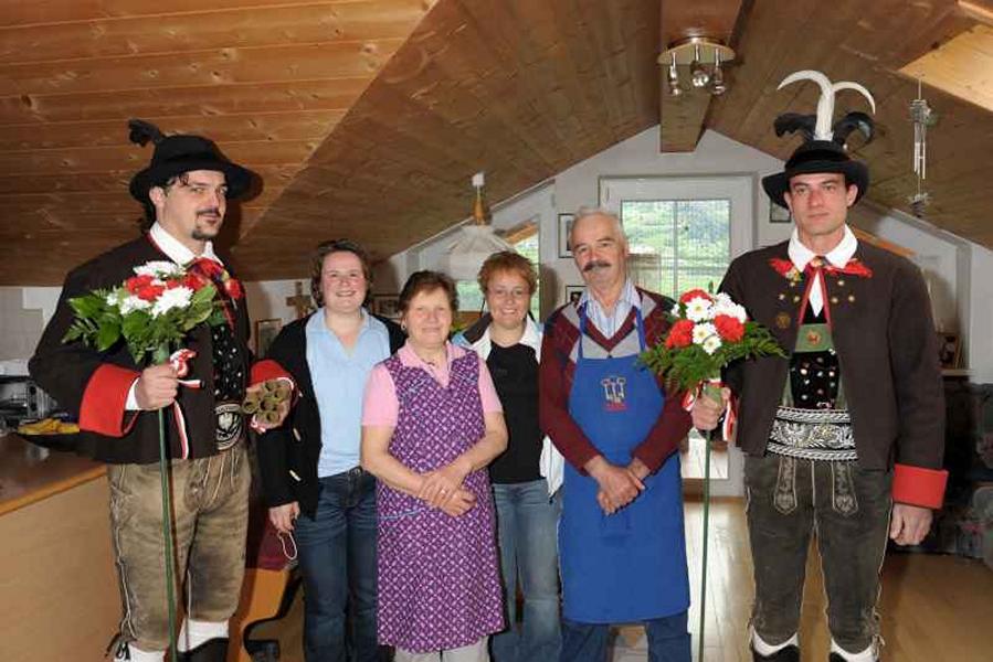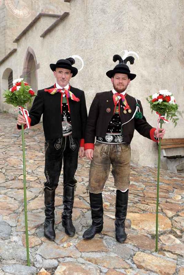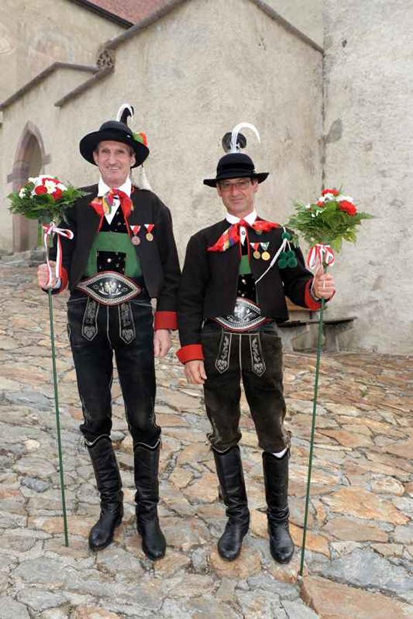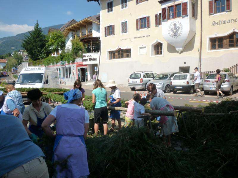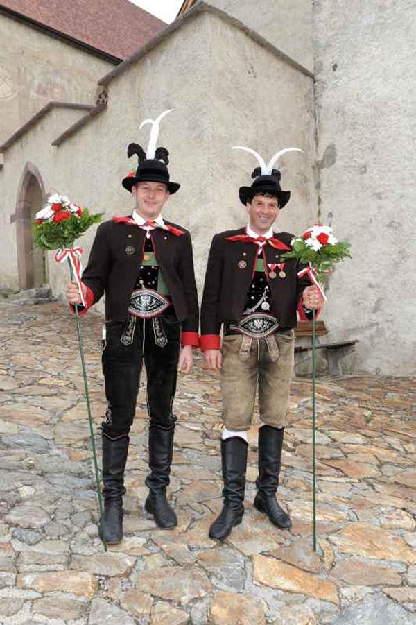 Es war und ist uns eine große Freude, dass nach fast 50 Jahren wieder eine Primiz in Villanders stattfinden konnte. Für uns war es eine besondere Ehr, bei den Vorbereitungen zu den Primizfeierlichkeiten im Komitee mitzuwirken. Die Schützenkompanie sah es als Pflicht, die Tradition der Primizgestaltung sowie des Primizladens weiterzuführen. Für das Primizladen meldeten sich 12 Schützen, um die vorgegebenen 125 Adressen aufzusuchen und traditionell mit einem Gedicht und der persönlichen Einladung von Konrad einzuladen. Zu den Primizladern gehörten Hannes Rabensteiner, Ewald Pichler, Michael Gruber, Karl Gruber, Martin Untermarzoner, Egon Herbst, Gerhard Webhofer, Walter Rabensteiner, Franz Gantioler, Oliver Klammsteiner, Konrad Anranter und Hans Anranter. Sogar im Bozner Dom hatten Karl Gruber und Martin Untermarzoner die Ehre, das Primizgedicht und die Einladung vorzubringen. Für alle war es ein Erlebnis und eine Erinnerung, die man nicht so schnell vergisst. Überall wurden wir herzlich empfangen und staunend wurde uns zugehört. In Villanders erfolgten die Einladungen von Walter Rabensteiner und dem Hauptmann Hannes Rabensteiner wie es die Tradition verlangte hoch zu Ross. Das Primizgedicht wurde von Maria Stoffner verfasst. Weiters war es für uns ein großes Anliegen, die Gestaltung der Primiz in die Hand zu nehmen. Wir übernahmen das Restaurieren und Aufhängen der Krone sowie das Aufstellen der zwei Triumphpforten, die eine Höhe von 15 Metern hatten. Es war eine große Herausforderung, da wirklich viel Arbeit bis zum Schluss anfiel. Doch durch die Unterstützung der Katholischen Frauenbewegung und unzähliger Privatpersonen, die beim Binden bei hohen Temperaturen Außerordentliches geleistet haben, gelang es, dass die Pforten sowie die Krone und die Girlanden rechtzeitig fertig wurden. Die Lieferung der „Tasen“ übernahmen die Bauern. Weitere Aufgaben, deren wir uns annahmen, waren die Organisation des Böllerns, der Leinwand, der beiden Filmer, des Fotografen, die Bestellung der Getränke und des Essens sowie von sämtlichem Zubehör, wie z.B. Budel, Bänke, Toiletten u.ä. Soviel zur Vorarbeit. Am Samstag war es für uns eine große Ehre, unseren Primizianten nach altem Brauch durch die Primizlader abzuholen. Unser