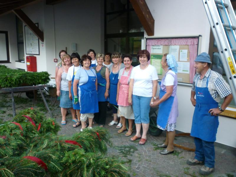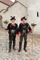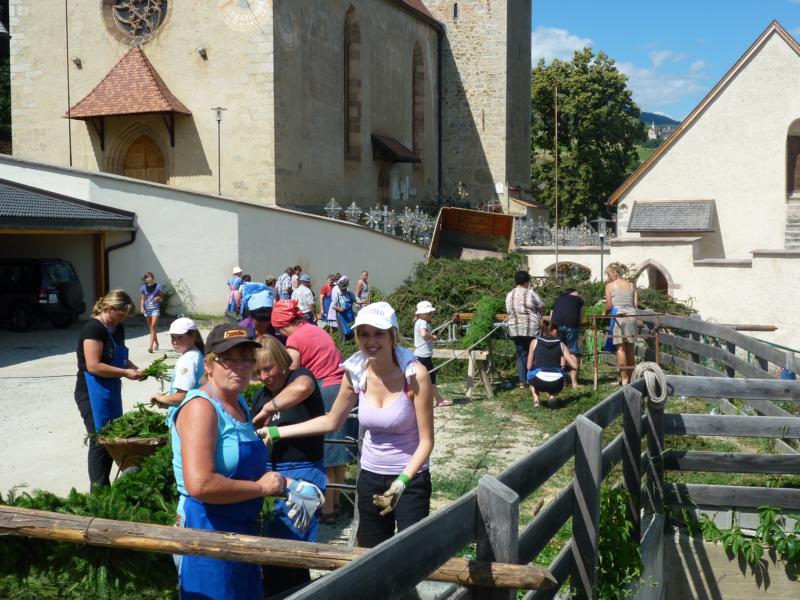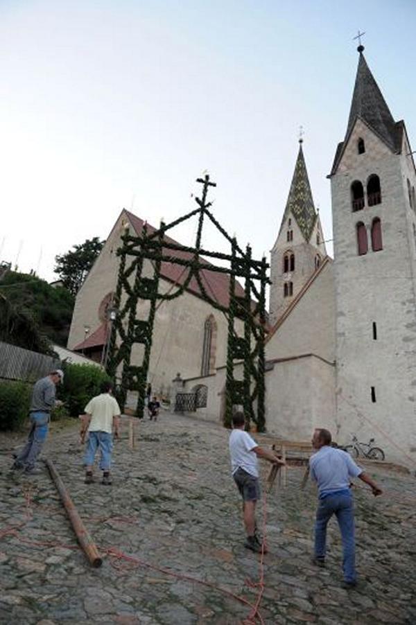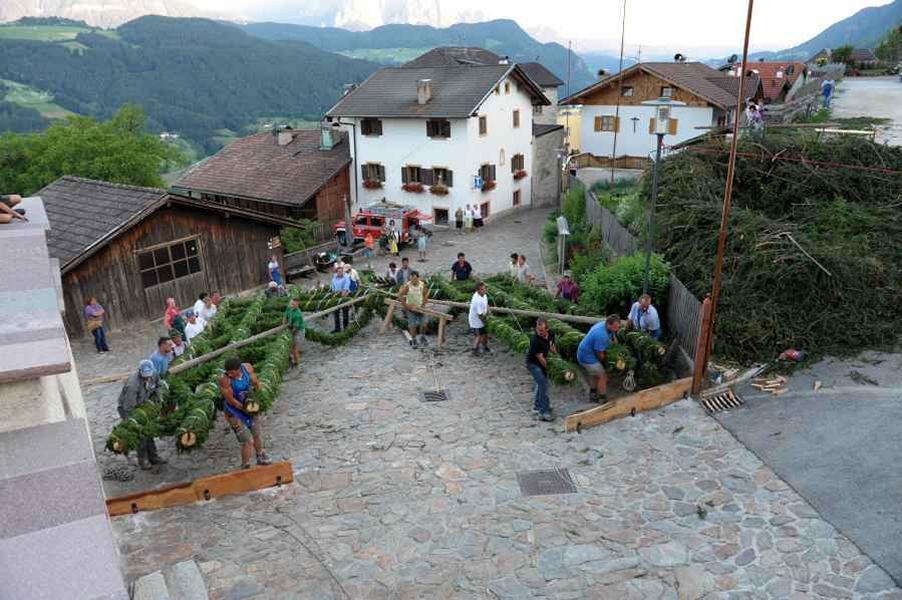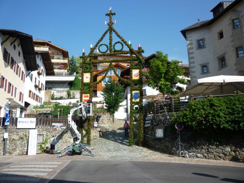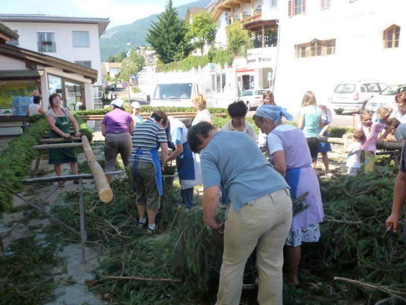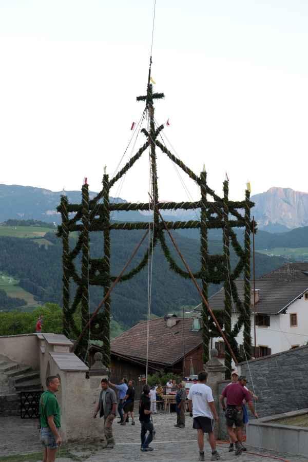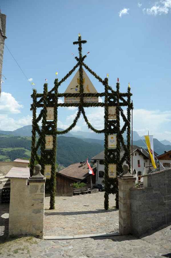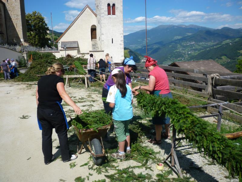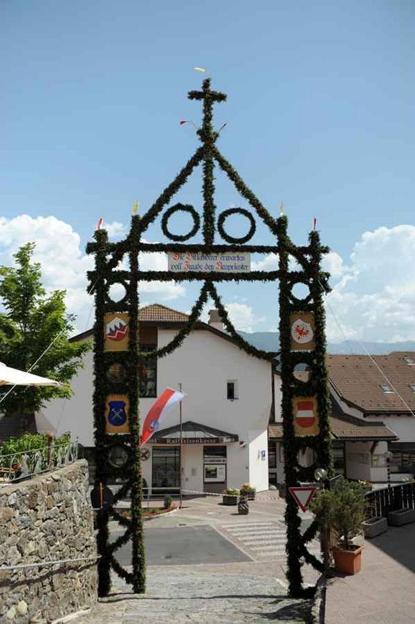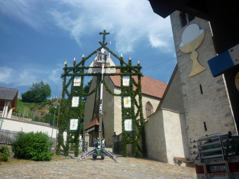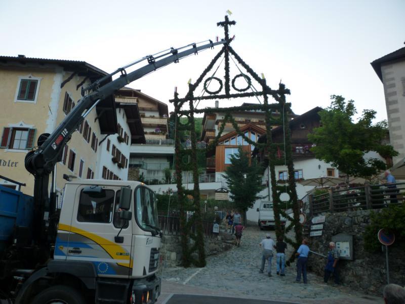 Es war und ist uns eine große Freude, dass nach fast 50 Jahren wieder eine Primiz in Villanders stattfinden konnte. Für uns war es eine besondere Ehr, bei den Vorbereitungen zu den Primizfeierlichkeiten im Komitee mitzuwirken. Die Schützenkompanie sah es als Pflicht, die Tradition der Primizgestaltung sowie des Primizladens weiterzuführen. Für das Primizladen meldeten sich 12 Schützen, um die vorgegebenen 125 Adressen aufzusuchen und traditionell mit einem Gedicht und der persönlichen Einladung von Konrad einzuladen. Zu den Primizladern gehörten Hannes Rabensteiner, Ewald Pichler, Michael Gruber, Karl Gruber, Martin Untermarzoner, Egon Herbst, Gerhard Webhofer, Walter Rabensteiner, Franz Gantioler, Oliver Klammsteiner, Konrad Anranter und Hans Anranter. Sogar im Bozner Dom hatten Karl Gruber und Martin Untermarzoner die Ehre, das Primizgedicht und die Einladung vorzubringen. Für alle war es ein Erlebnis und eine Erinnerung, die man nicht so schnell vergisst. Überall wurden wir herzlich empfangen und staunend wurde uns zugehört. In Villanders erfolgten die Einladungen von Walter Rabensteiner und dem Hauptmann Hannes Rabensteiner wie es die Tradition verlangte hoch zu Ross. Das Primizgedicht wurde von Maria Stoffner verfasst. Weiters war es für uns ein großes Anliegen, die Gestaltung der Primiz in die Hand zu nehmen. Wir übernahmen das Restaurieren und Aufhängen der Krone sowie das Aufstellen der zwei Triumphpforten, die eine Höhe von 15 Metern hatten. Es war eine große Herausforderung, da wirklich viel Arbeit bis zum Schluss anfiel. Doch durch die Unterstützung der Katholischen Frauenbewegung und unzähliger Privatpersonen, die beim Binden bei hohen Temperaturen Außerordentliches geleistet haben, gelang es, dass die Pforten sowie die Krone und die Girlanden rechtzeitig fertig wurden. Die Lieferung der „Tasen“ übernahmen die Bauern. Weitere Aufgaben, deren wir uns annahmen, waren die Organisation des Böllerns, der Leinwand, der beiden Filmer, des Fotografen, die Bestellung der Getränke und des Essens sowie von sämtlichem Zubehör, wie z.B. Budel, Bänke, Toiletten u.ä. Soviel zur Vorarbeit. Am Samstag war es für uns eine große Ehre, unseren Primizianten nach altem Brauch durch die Primizlader abzuholen. Unser