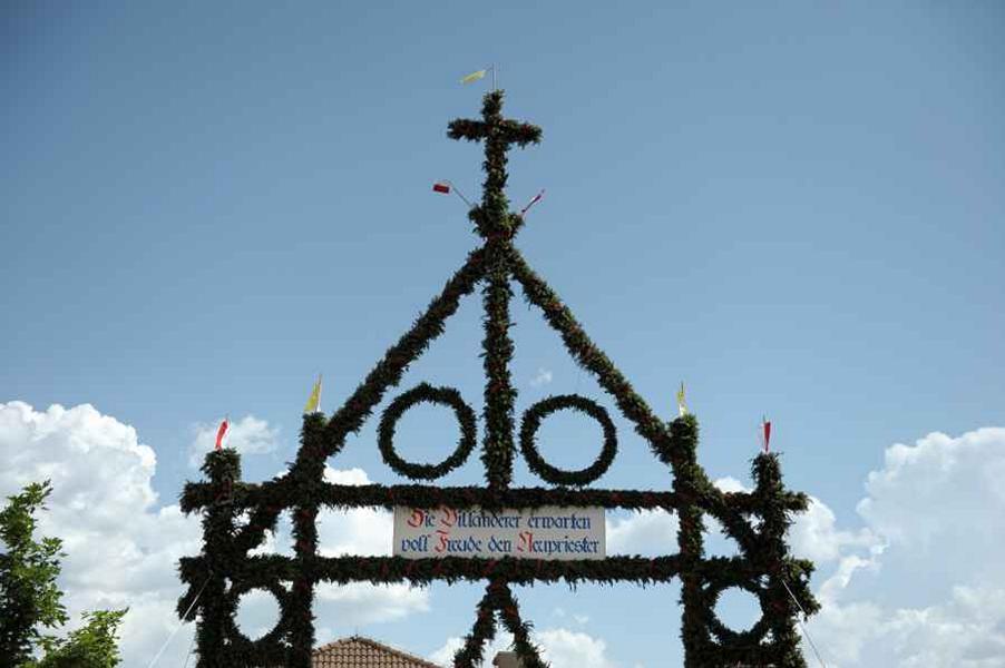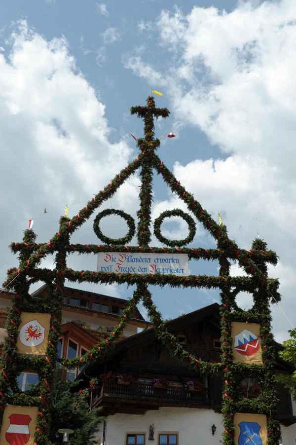 Neupriester wurde von einer Kutsche zum Empfang gebracht, welche der Pferdesportverein organisierte. Begleitet von den 12 Primizladern, davon 5 hoch zu Ross und die restlichen 7 als Begleitung, freute sich Konrad über den Empfang sehr. Umgeben von einer großen Menschenmenge wurde der Primiziant von unserem Bürgermeister im Dorfzentrum begrüßt. Danach konnte er zum ersten Mal dem Gedicht der Primizlader gespannt folgen. Anschließend durften wir ihm durch das Abfeuern einer Ehrensalve unsere höchste Ehrerbietung erweisen. Schließlich folgte durch die Vereine der feierliche Einzug in die Kirche. Konrad wurde an beiden Tagen stets von den Primizladern begleitet. Ebenfalls an beiden Tagen konnte Konrad sich auf ein Spalier der Schützen und der Volkstanzgruppe vor der Kirche freuen. Im Anschluss an den Wortgottesdienst zog eine feierliche Lichterprozession zum Widum, wo mit einem Gebet der Abschluss erfolgte. Die Fackeln wurden von den Schützen getragen. Als weitum sichtbares Zeichen wurde von uns ein 10 m hohes Gestell aus Eisen mit dem Herz-Jesu-Symbol entzündet. Die Anwesenden waren sichtlich von den Fensterbildern und der gesamten Gestaltung der Primiz begeistert. Auch der Sonntag war gekennzeichnet von einer sehr feierlichen Atmosphäre. Auch da waren wieder die meisten Vereine eingebunden. Gott sei Dank spielte auch das Wetter mit, und die mühevolle Arbeit wurde an beiden Tagen von jedermann bewundert. Am Sonntag konnten dann viele Menschen die Primiz auch vor der Kirche auf der Leinwand verfolgen. Die anschließende Prozession erfolgte in der üblichen Reihenfolge, aber mit wesentlich mehr Mitbetenden. Es war sicher für alle Villanderer und Villanderinnen ein unvergessliches Erlebnis, und Dank der guten Zusammenarbeit der ganzen Bevölkerung waren es zwei gelungene Tage, die sicherlich dem Neupriester Konrad Gasser für den Start auf seinem neuen Lebensweg viel Freude bereitet haben.