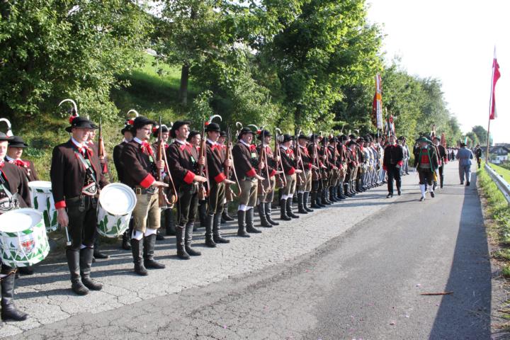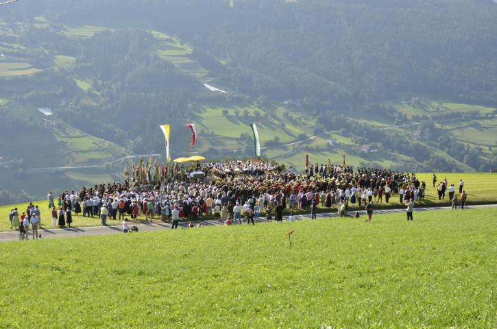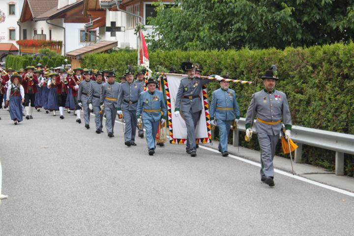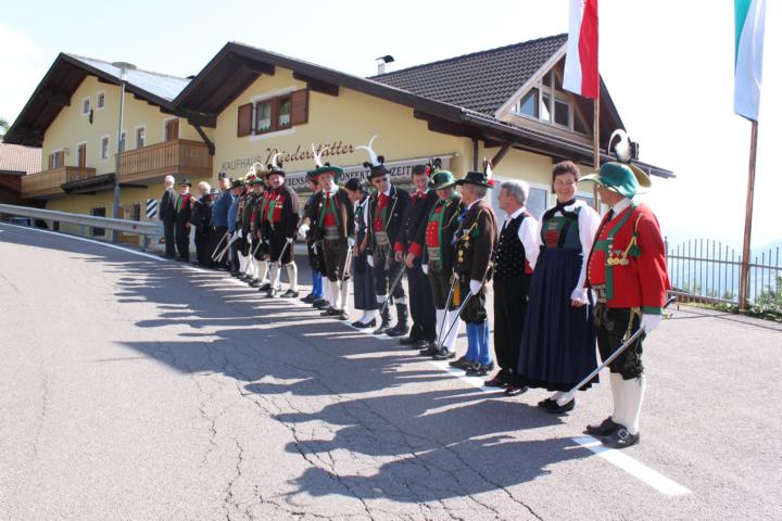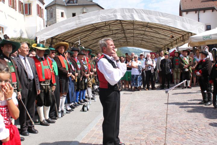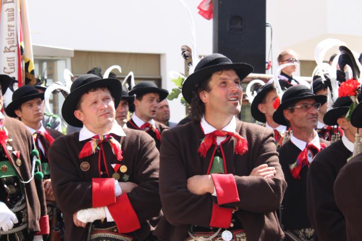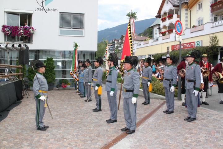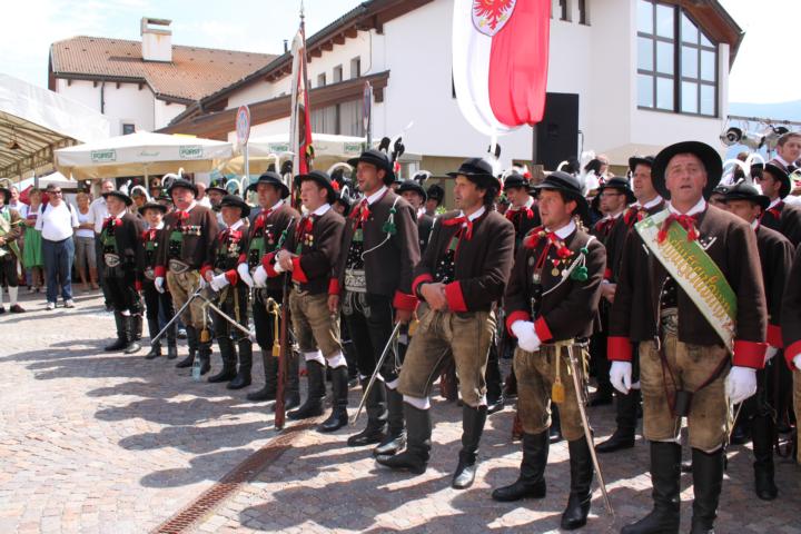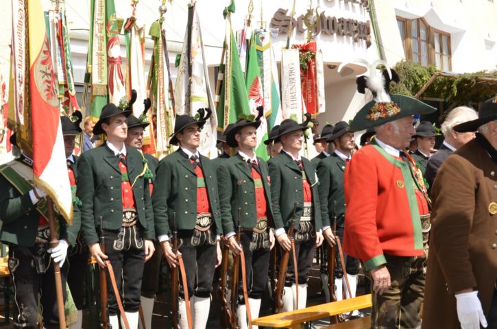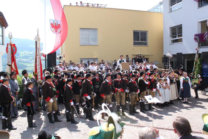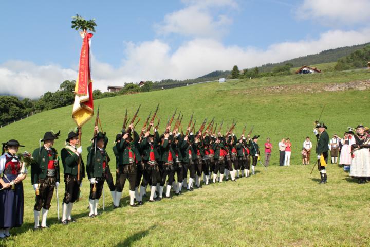 Am Sonntag trafen die Schützenkompanien und die Fahnenabordnungen ein, Frontabschreitung und Abmarsch zur Feldmesse und Ur-Aufführung der "Südtirol Messe" von Maridl Innerhofer und Konrad Plaikner mit der Musikkapelle Peter Mayer Pfeffersberg.