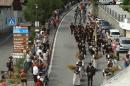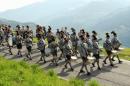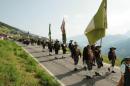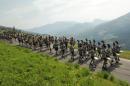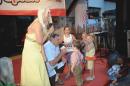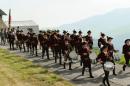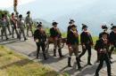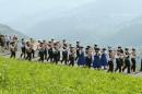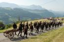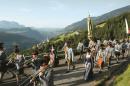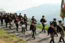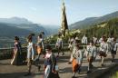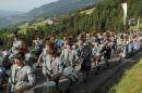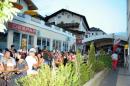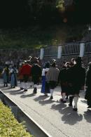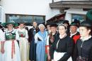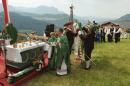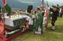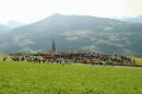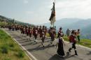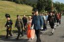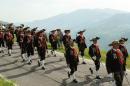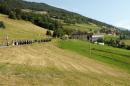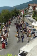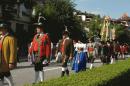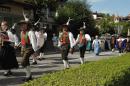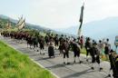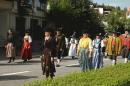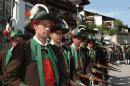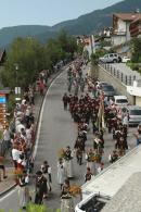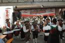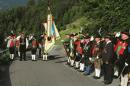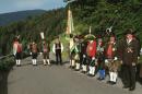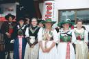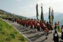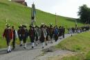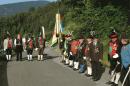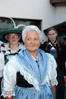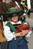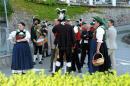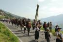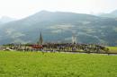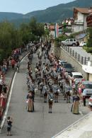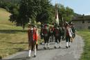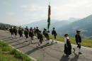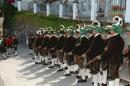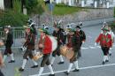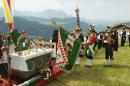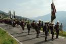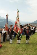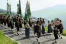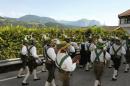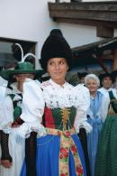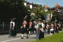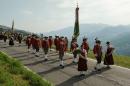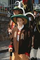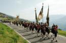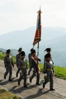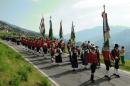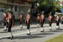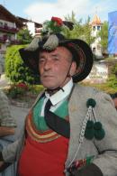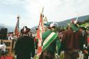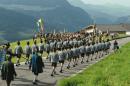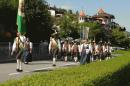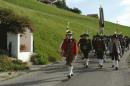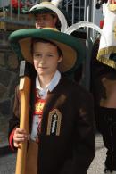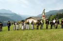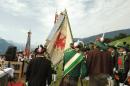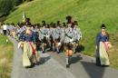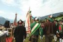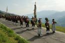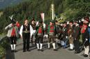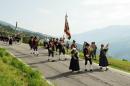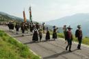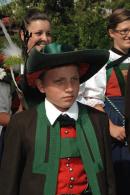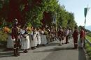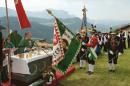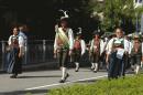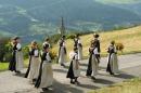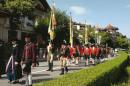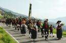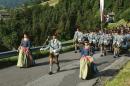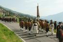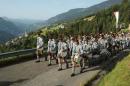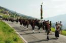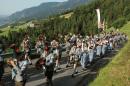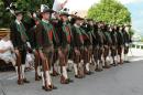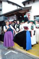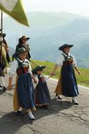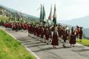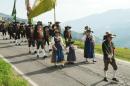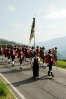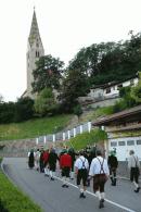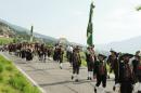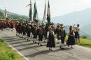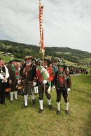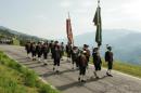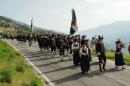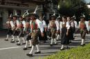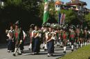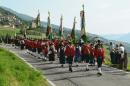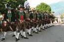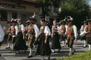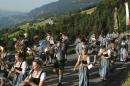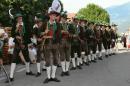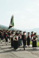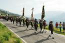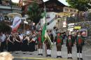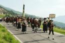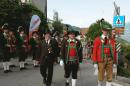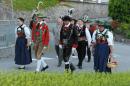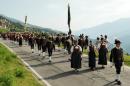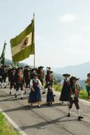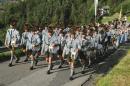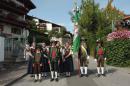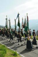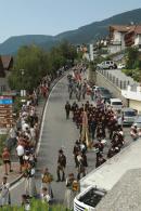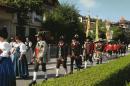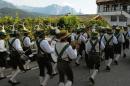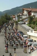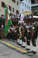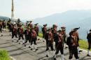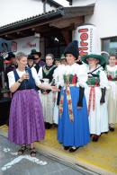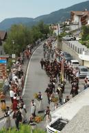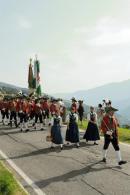 Nach der Feldmesse Festumzug ins Dorf mit Defilierung beim Kaufhaus Niederstätter.