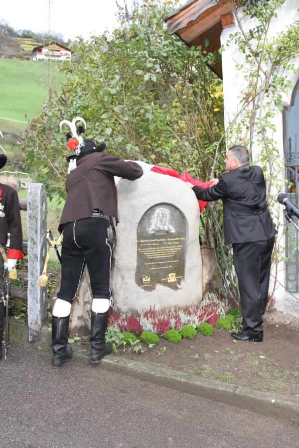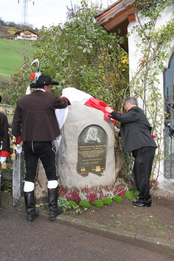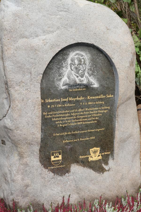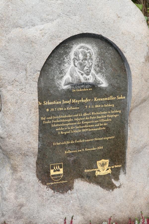 Zu Ehren unseres 2. Hauptmannes von 1809 Dr. Josef Sebastian Mayerhofers wurde in Kollmann zum 150. Todestages ein Gedenkstein eingeweiht. Um 9.30 Uhr Aufstellung und Abmarsch mit der Musikkapelle Kollmann zur Kirche wo die Messe stattfand. Anschließend Abmarsch zum Kreuzmüller wo der Stein eingeweiht wurde und wir eine Ehrensalve abfeuerten. Beim Kreuzmüller Karl wurden wir dann zu Speis und Trank eingeladen. Bei der Organisation hat unser Hptm. Hannes mitgeholfen und die Gedenktafel wurde zur Hälfte von der Kompanie gezahlt. Mit dabei waren 3 Marketenderinnen, 29 Schützen, 4 Jungschützen und 3 Kaiserjäger.