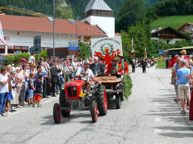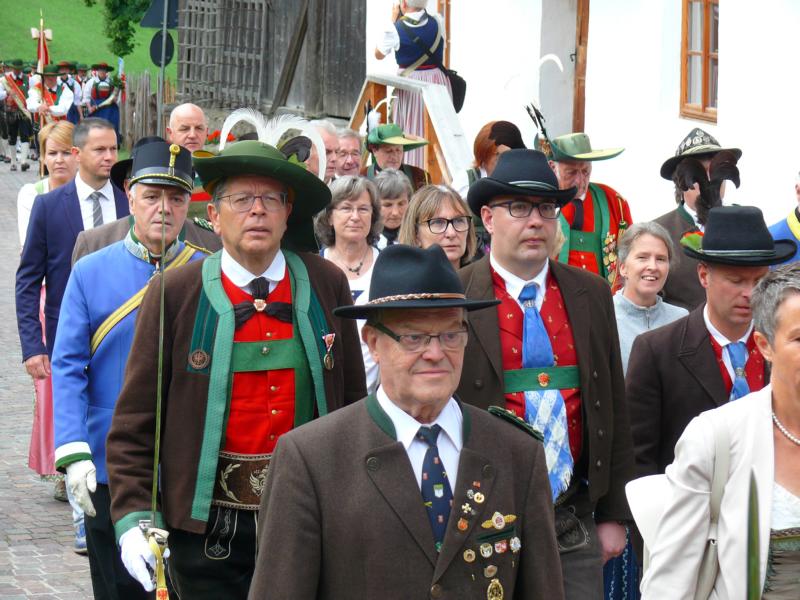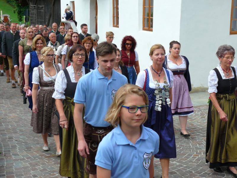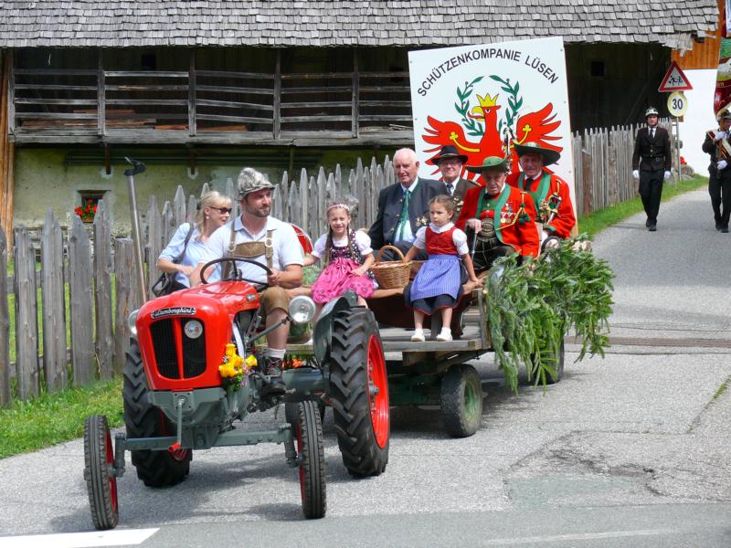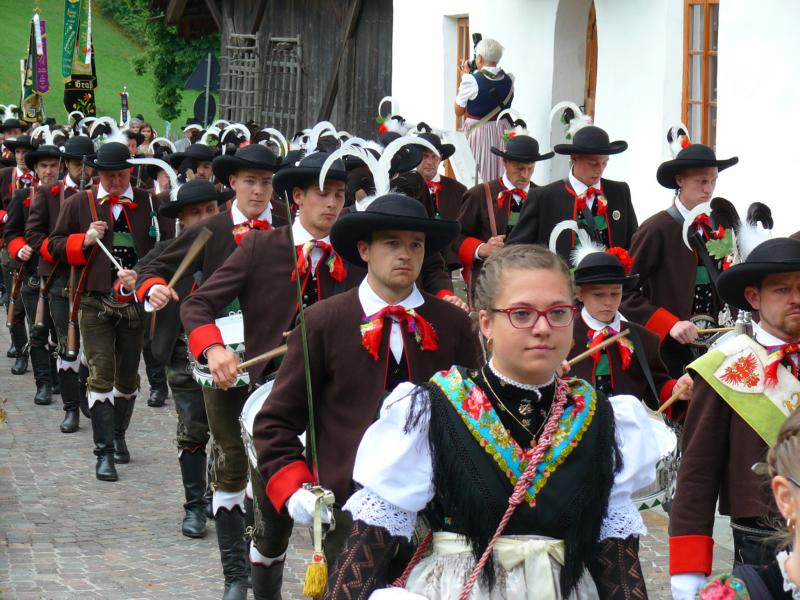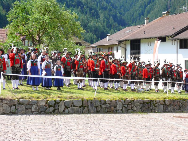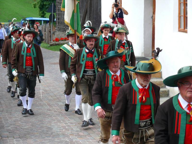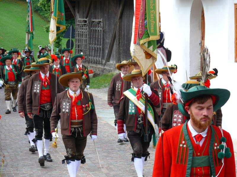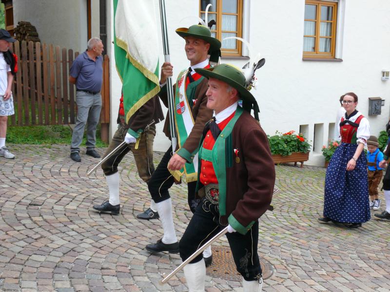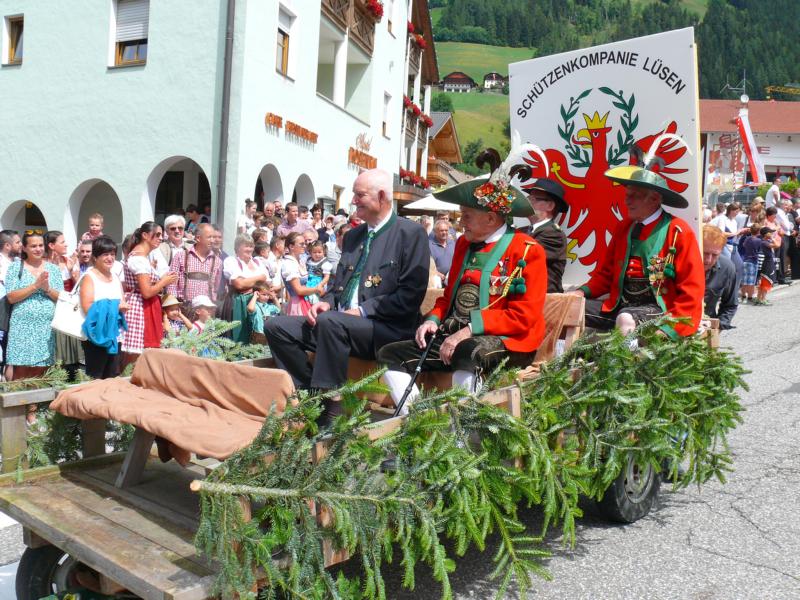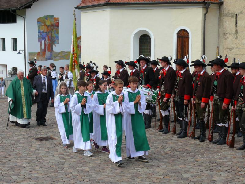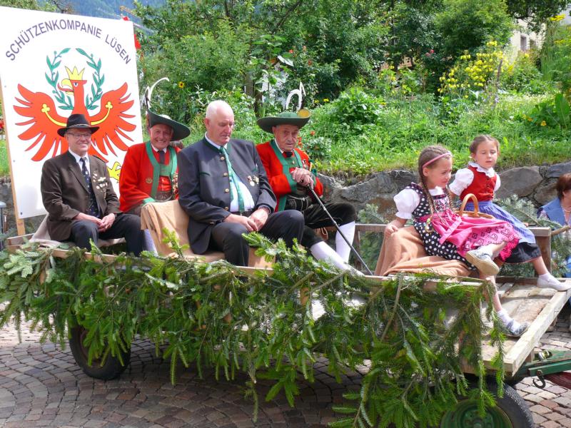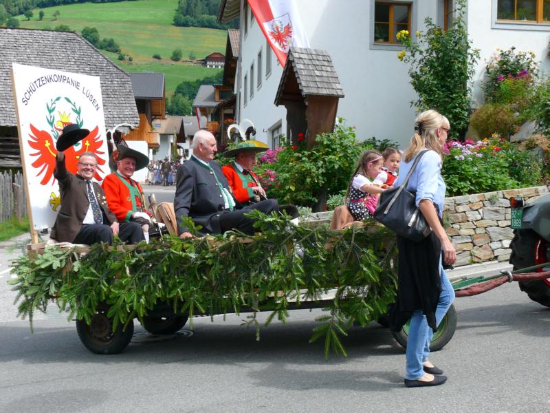 Bereits um 7 Uhr morgens trafen wir uns im Dorf und machten uns mit einem Bus Richtung Lüsen. Nach der Aufstellung, Frontabschreitung und Einzug folgte um 9 Uhr die Feldmesse auf dem Widumhof. Nach der Messe und einer gelungenen Ehrensalve ging der Festumzug mit Defilierung durchs Dorf los. Als wir an Festbesuchern vorbeimarschierten, ertönte lauter Beifall und viel Lob für unser Erscheinungsbild. Ein besonderes Highlight war unter anderem, dass unsere Jungmarketenderinnen beim Einzug mit der Schwegelpfeife spielten aber auch, dass wir unsere Kanone mitführten. An diesem Tag dabei waren 33 Schützen, 6 Marketenderinnen, 1 Jungschütze und 4 Jungmarketenderinnen.