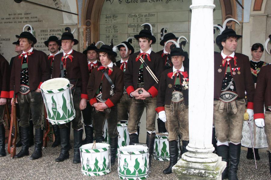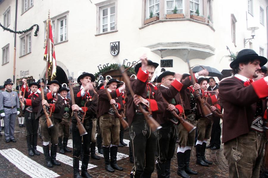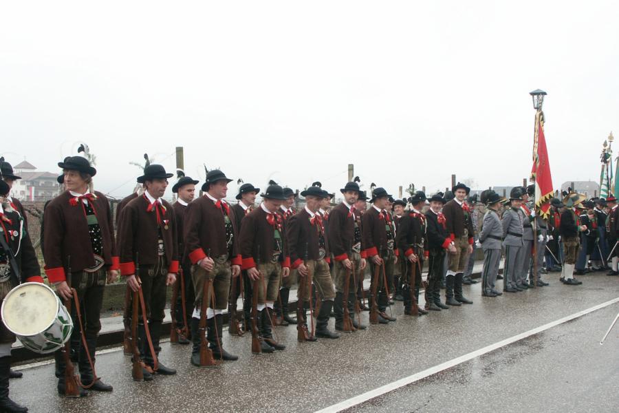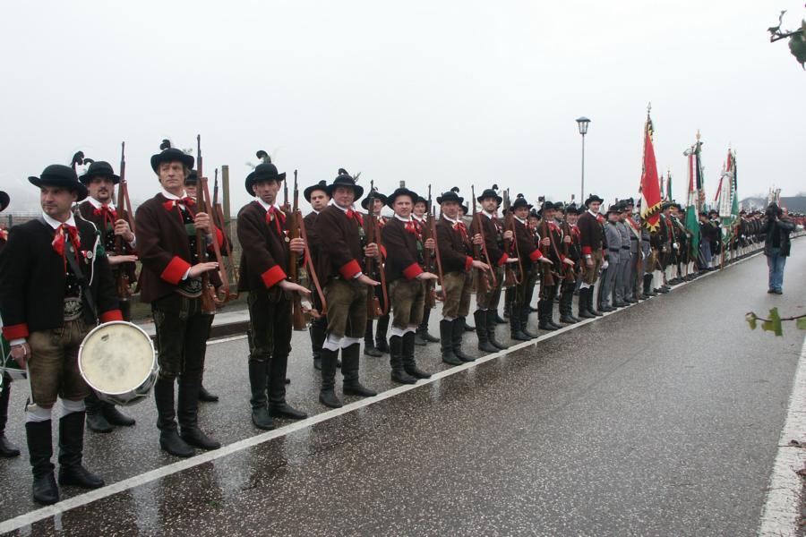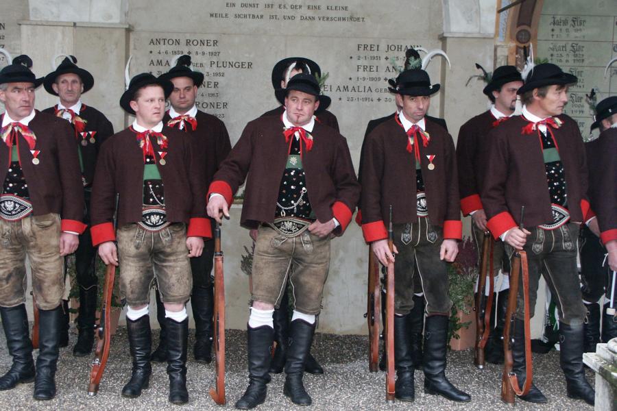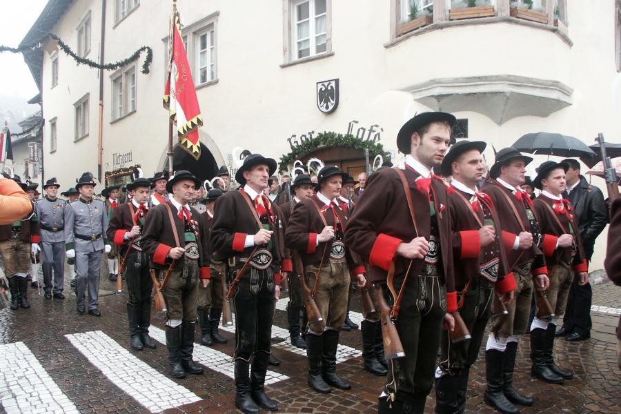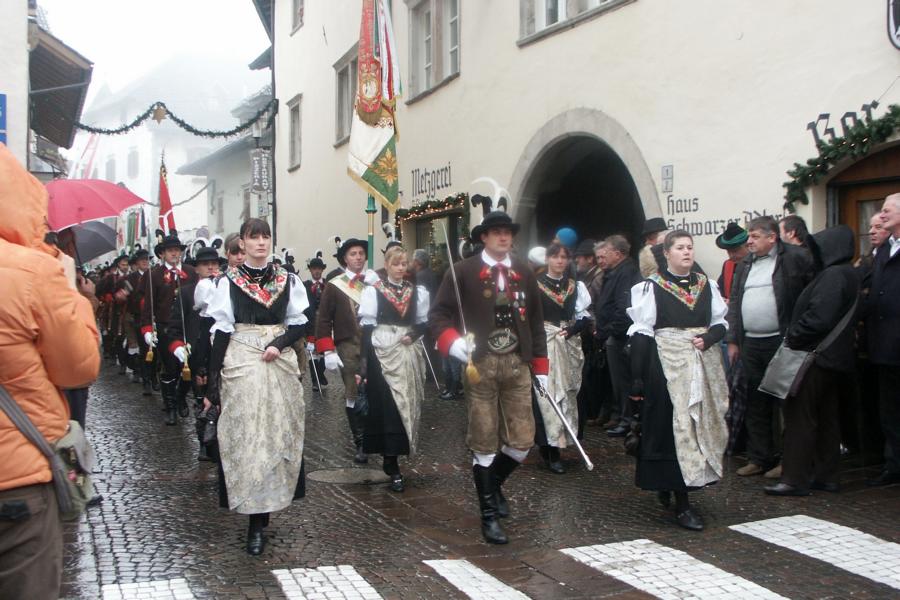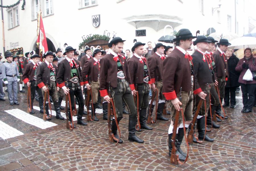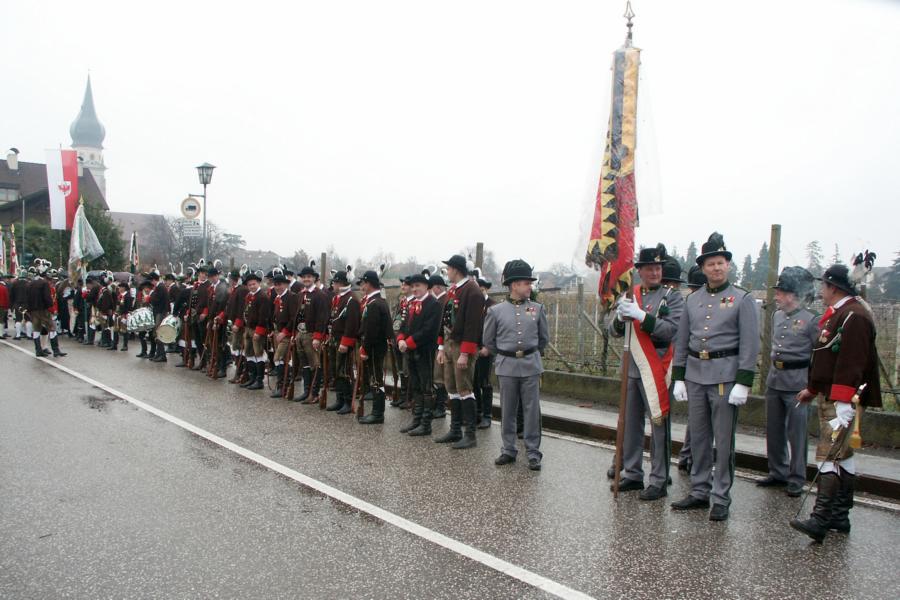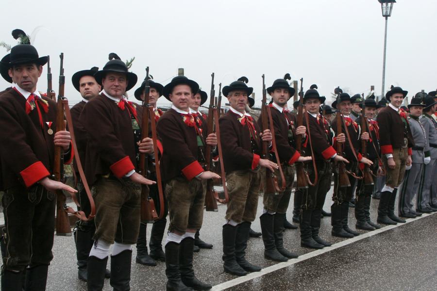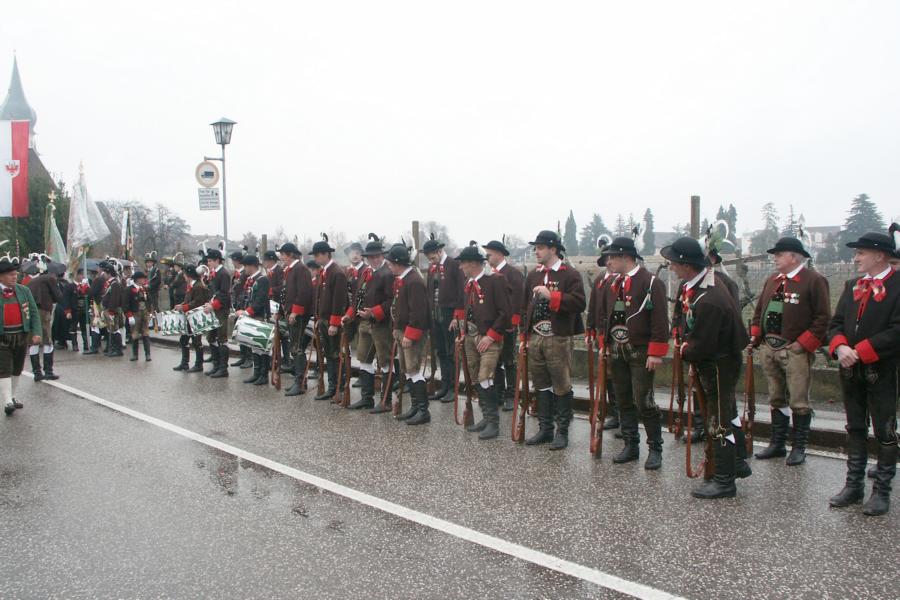8. Dezember 2009: Nachdem die Schützenkompanie Anton von Gasteiger Villanders wie jedes Jahr fast vollzählig an der Sepp-Kerschbaumer-Gedenkfeier in St. Pauls teilnahm, ging diesmal die Fahrt nicht nach Hause sondern nach Innsbruck, wo die Orig. Tiroler Kaiserjägermusik zu ihrem alljährlichen Galakonzert geladen hatte. In Innsbruck angekommen nutzte die Schützenkompanie die Gelegenheit in der Hofkirche eine Kranzniederlegung vorzunehmen. Man gedachte zum einen, dem Oberkommandanten der Tiroler Schützen, Andreas Hofer sowie dem zweiten Hauptmann der Schützenkompanie Villanders von 1809, Dr. Sebastian-Josef Mayrhofer, für den ein Gedenkstein in der Hofkirche errichtet wurde. Hptm. Hannes Rabensteiner erinnerte in seiner Gedenkrede an die Lebensgeschichte von Dr. Mayrhofer, welcher sich einen Ehrenplatz in der Geschichte der Tiroler Helden verdient. Bei diesem für die Kompanie sehr feierlichen Akt waren auch Kameraden der SK Patsch sowie Senatsrat Dr. Franz-Heinz von Hye anwesend, welcher anschließend noch kurz auf die Geschichte der Hofkirche einging. Abschließend wurde die Landeshymne abgesungen. Nach der feierlichen Kranzniederlegung war es aber auch schon Zeit für den Start des Galakonzertes, welches die Orig. Tiroler Kaiserjägermusik ganz im Zeichen eines gesamttiroler Bildes organisierte. Das Galakonzert begann mit dem Abfeuern einer gelungenen Ehrensalve durch die SK Anton von Gasteiger Villanders in Anwesenheit von Frau Hilde Zach, Bürgermeisterin und Kulturreferentin der Nordtiroler Landeshauptstadt Innsbruck, Frau Dr. Beate Palfrader, Landesrätin für Bildung und Kultur, den beiden Landeskommandanten Otto von Sarnthein und Paul Bacher sowie Bezirksmajor Sepp Kaser. Nachdem der zweite Teil des Galakonzertes ganz im Zeichen des Gedenkjahres stand, stürmten die Kompanien von Patsch und Villanders unter Trommelwirbel den vollbesetzten Tirolersaal im Congresshaus und nahmen Stellung auf der Bühne neben der Orig. Tiroler Kaiserjägermusik. Durch den Auftritt der beiden Kompanien mit der Kaiserjägerkapelle und das Abspielen der Tiroler Märsche schlug jedes Tiroler Herz höher! Man war wohl für diese Stunde mehr als vereint und die Hoffnung, auf eine Wiedervereinigung Tirols war im gesamten Saal spürbar. Außerdem freute es uns, mit der Kompanie aus Patsch Bekanntschaft zu machen.