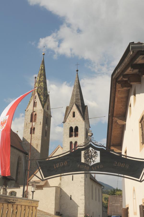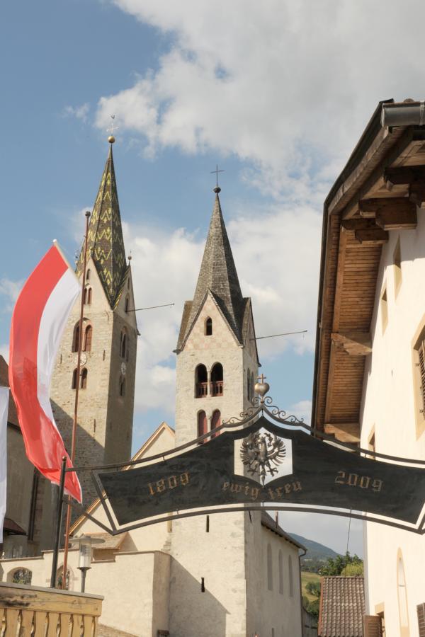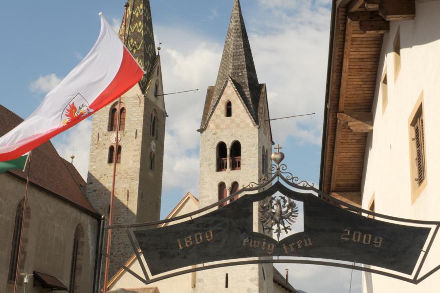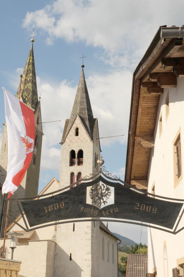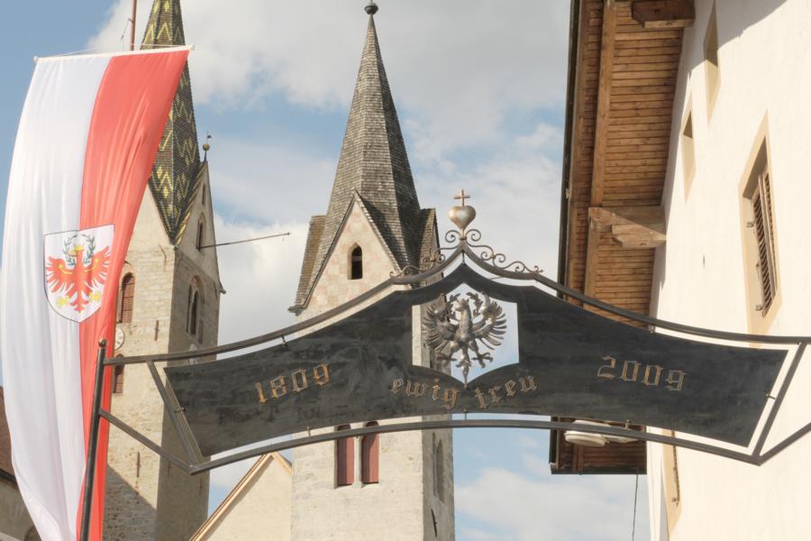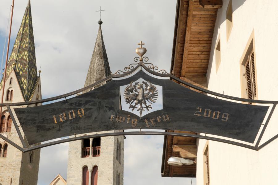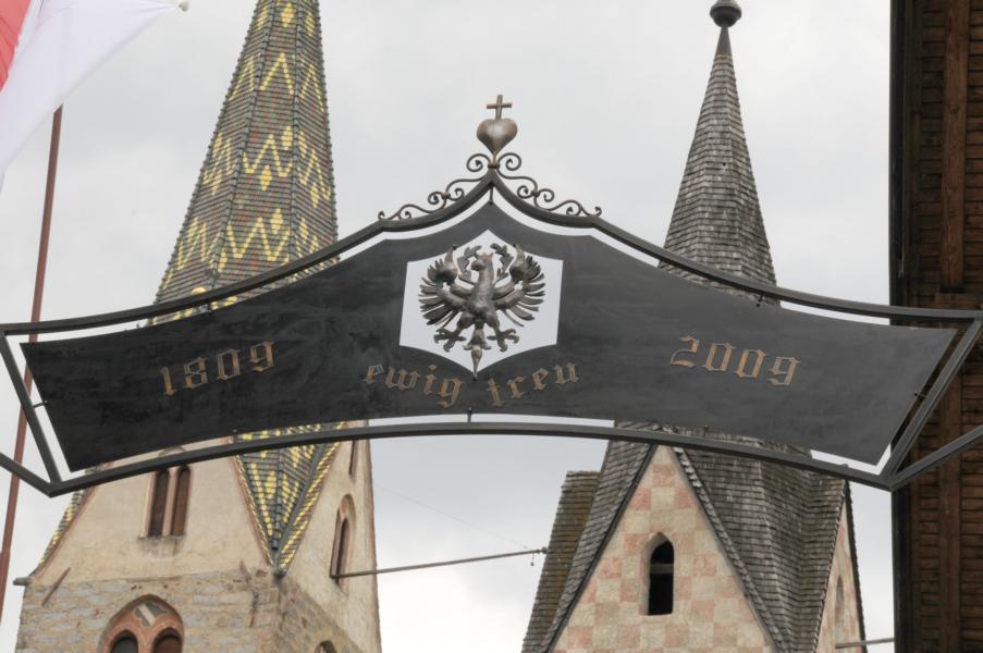 Dieser Gedenkbogen wurde Anlässlich der Feierlichkeiten 1809-2009 in Ehrfurcht und Dankbarkeit für jene errichtet, welche sich für Religion, Gerechtigkeit, Wahrheit, Kultur, Tradition, Sprache und für den Erhalt unserer schönen Heimat einsetzten und kämpften.