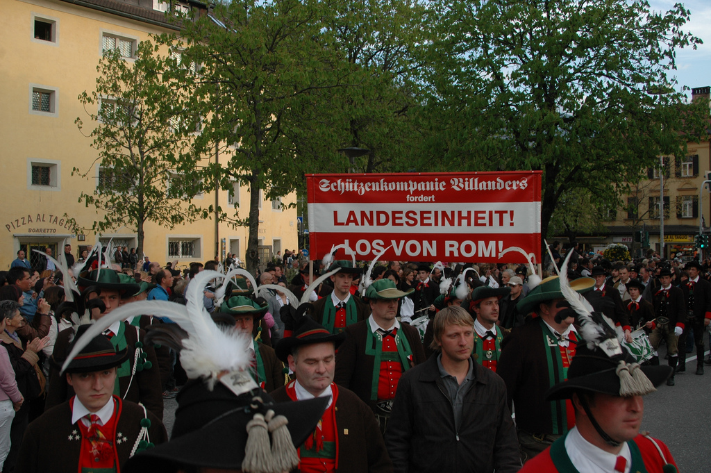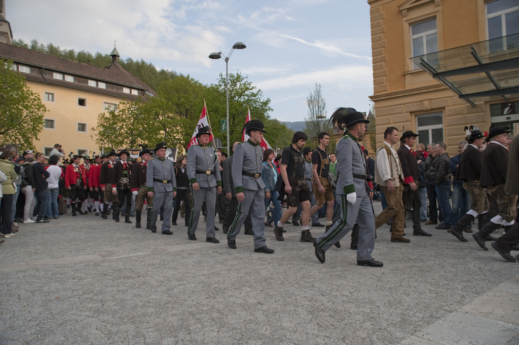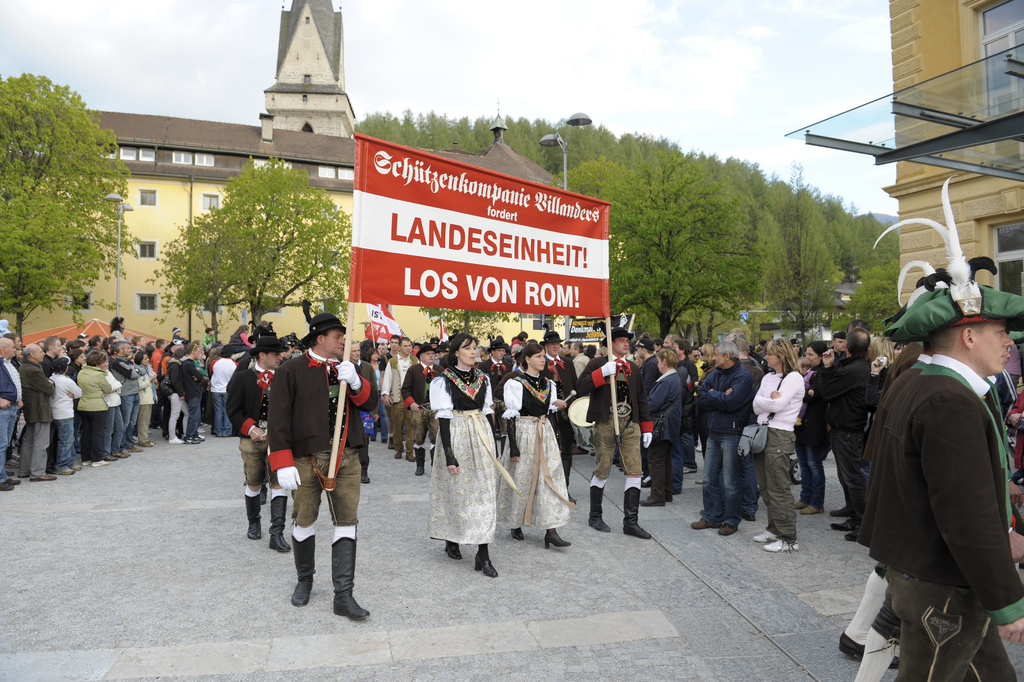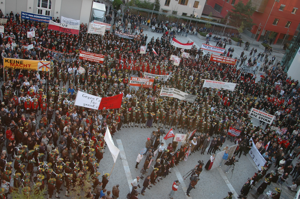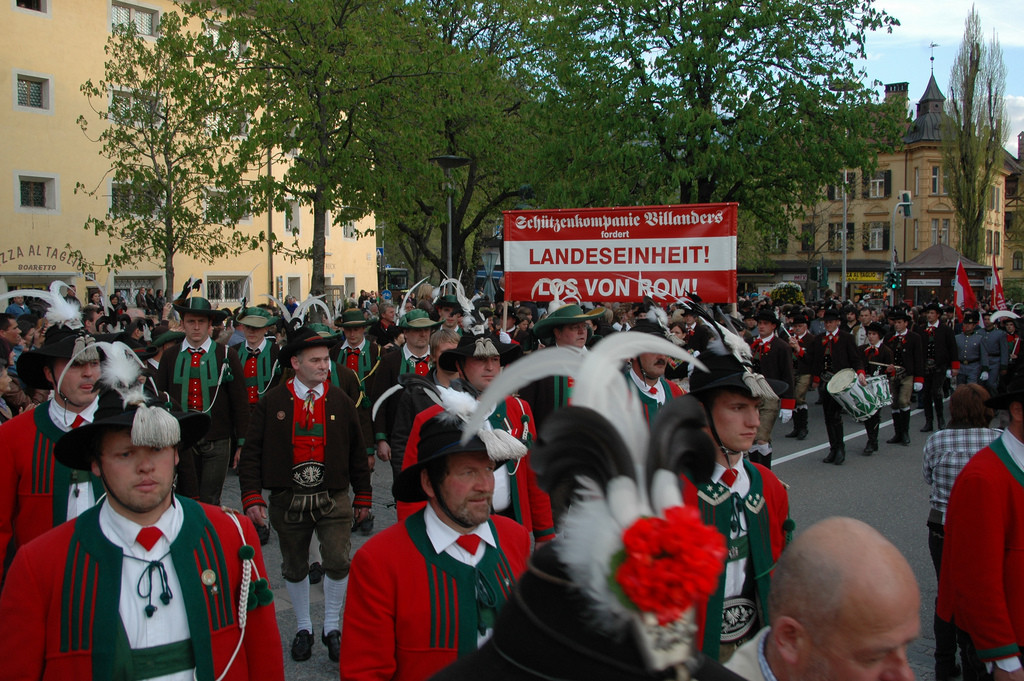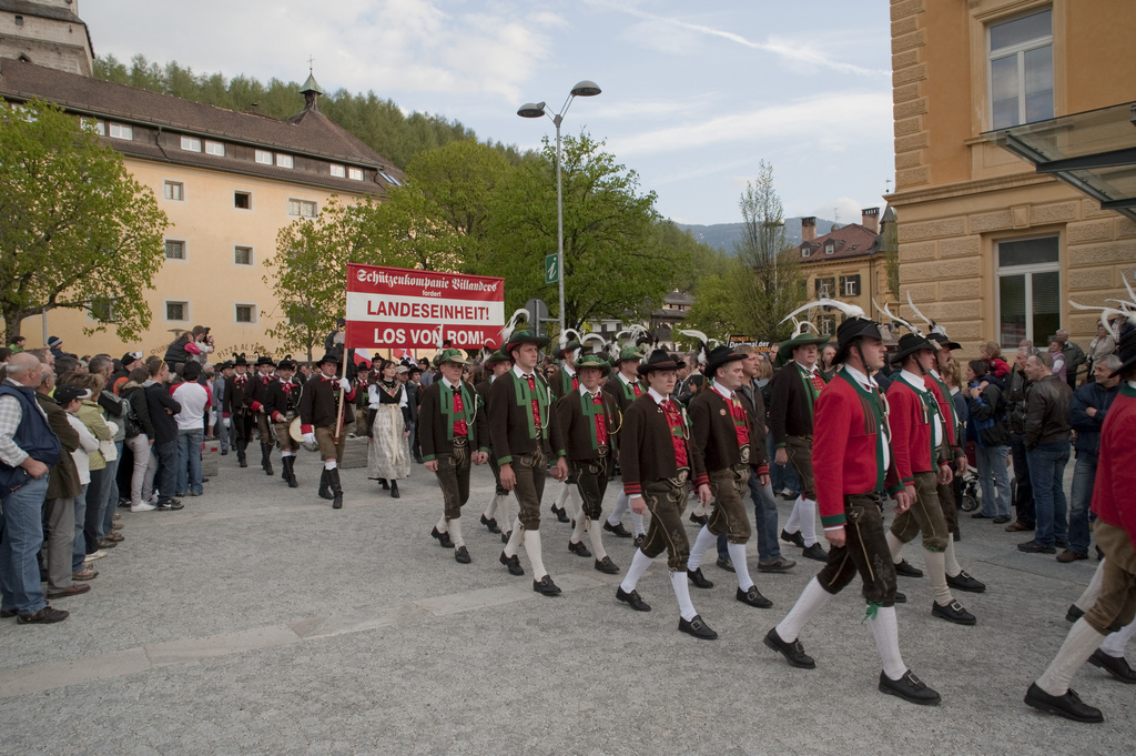 Bei der Kundgebung gegen Faschismus für Tirol waren ca. 2.500 Schützen mit dabei. Start war in der Schulzone wo wir mit Trommelwirbel und unserem Protestplakat, welches wir schon in Bozen mittrugen, bis zum Rathausplatz marschierten. Hunderte von Zuschauern begleiteten uns mit Applaus bis zum Rathausplatz. Nach Begrüßung von Bezirksmajor Heinrich Sayr machte der Landesschützenkommandant Paul Bacher darauf aufmerksam, dass in Italien viele faschistische Relikte immer noch nicht entfernt sind. Besonders sichtbar ist dies in Bozen und Bruneck. Wir lassen uns nicht davon abbringen, die Öffentlichkeit darauf aufmerksam zu machen, dass Denkmäler dieser Art in Europa keine Daseinsberechtigung haben. Bundesgeschäftsführer Elmar Thaler gab bekannt, dass der Schützenbund in Äthiopien ein Schulprojekt unterstützt. Es wurden dafür Spenden gesammelt. Im Manifest gegen Faschismus für Tirol wurden 2 Punkte festgehalten. Im ersten Teil die Entfernung des Kapuziner Waschtels. Im zweiten Teil die Autonomie sei nur eine Zwischenlösung und fordert das Ziel: die Selbstbestimmung. Zum Abschluss wurde die Landeshymne abgespielt und die Schützen gingen wieder friedlich nach Hause. Zum lächerlichen Teil hat der Quästor über 600 Ordnungskräfte nach Bruneck entsandt und die natürlich von uns Steuerzahlern bezahlt werden müssen. Mit dabei waren 16 Schützen, 2 Marketenderinnen, 7 Kaiserjäger und 9 Zivilisten.