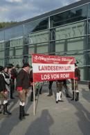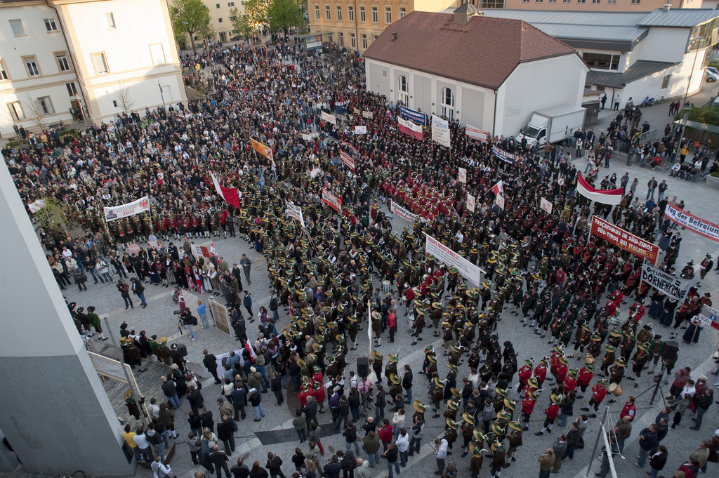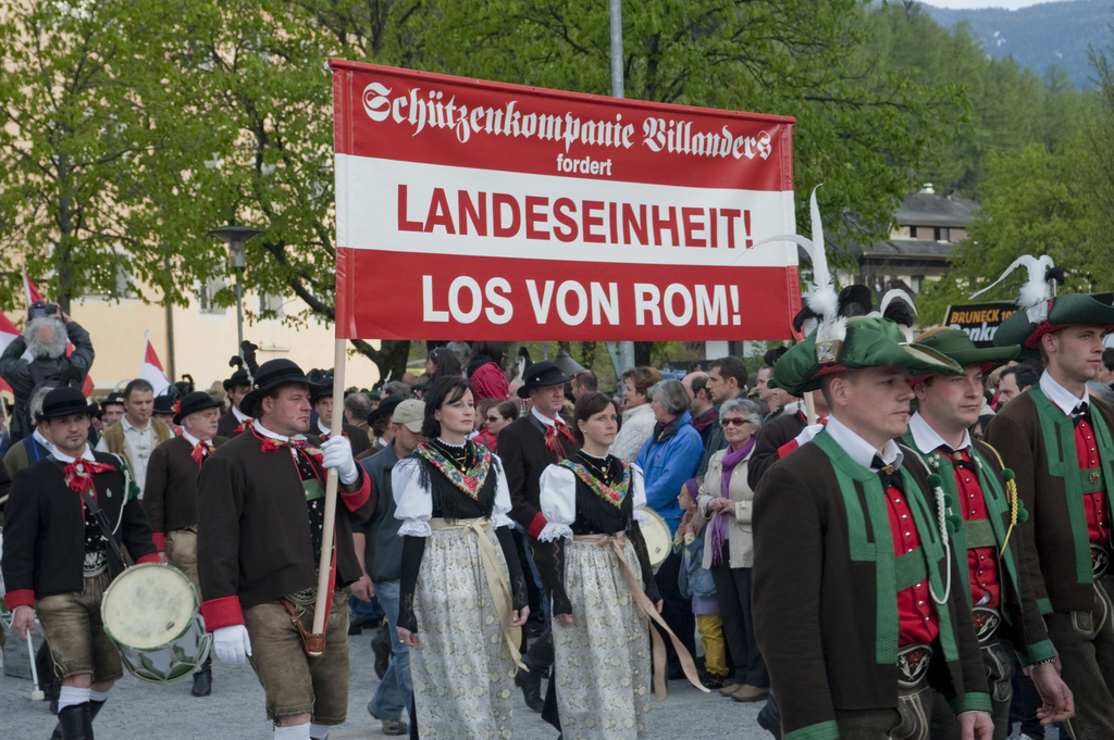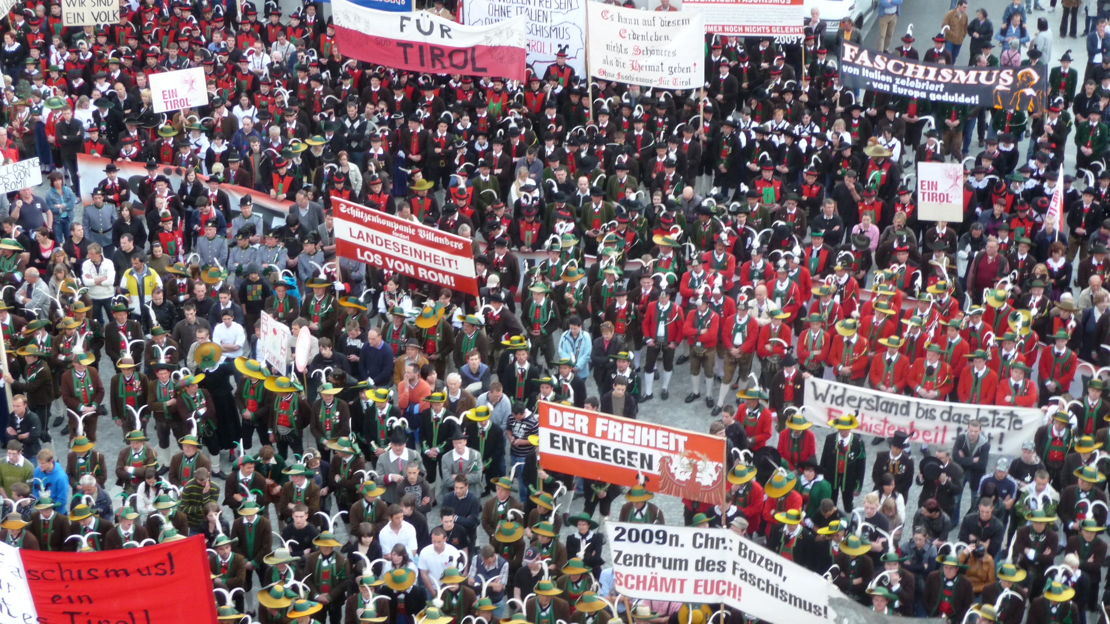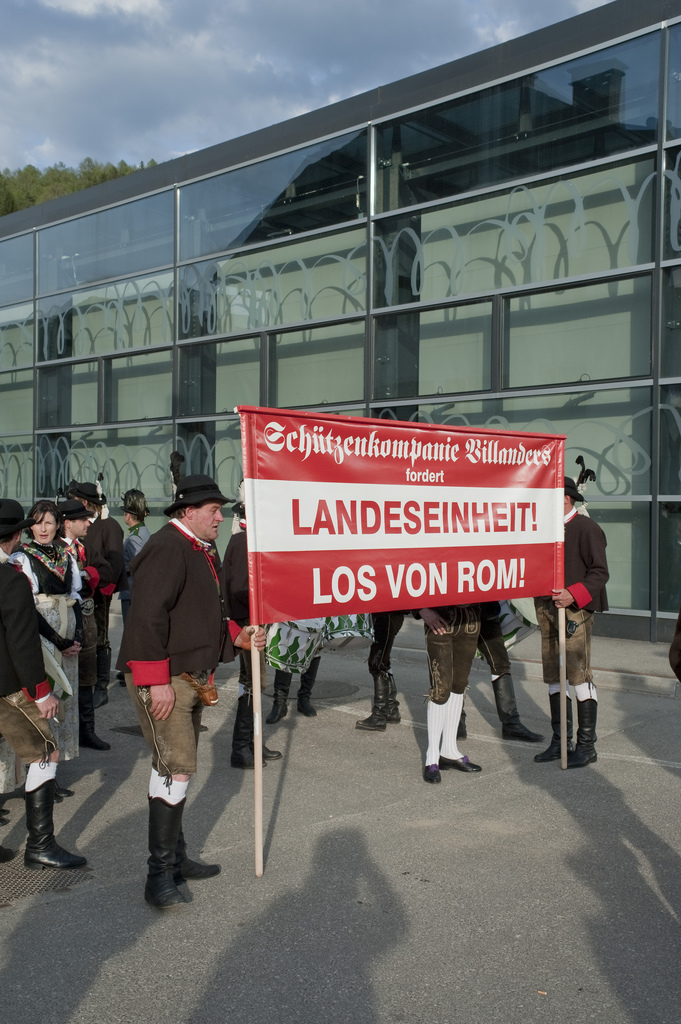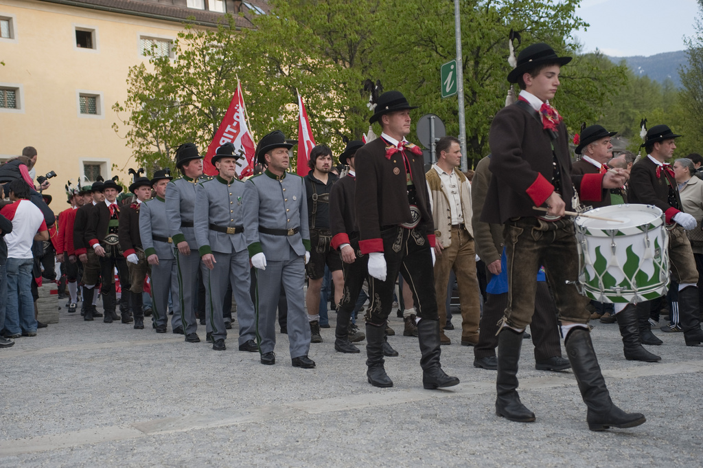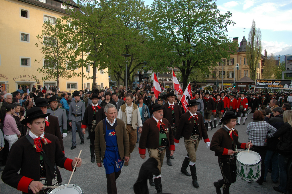 Bei der Kundgebung gegen Faschismus für Tirol waren ca. 2.500 Schützen mit dabei. Start war in der Schulzone wo wir mit Trommelwirbel und unserem Protestplakat, welches wir schon in Bozen mittrugen, bis zum Rathausplatz marschierten. Hunderte von Zuschauern begleiteten uns mit Applaus bis zum Rathausplatz. Nach Begrüßung von Bezirksmajor Heinrich Sayr machte der Landesschützenkommandant Paul Bacher darauf aufmerksam, dass in Italien viele faschistische Relikte immer noch nicht entfernt sind. Besonders sichtbar ist dies in Bozen und Bruneck. Wir lassen uns nicht davon abbringen, die Öffentlichkeit darauf aufmerksam zu machen, dass Denkmäler dieser Art in Europa keine Daseinsberechtigung haben. Bundesgeschäftsführer Elmar Thaler gab bekannt, dass der Schützenbund in Äthiopien ein Schulprojekt unterstützt. Es wurden dafür Spenden gesammelt. Im Manifest gegen Faschismus für Tirol wurden 2 Punkte festgehalten. Im ersten Teil die Entfernung des Kapuziner Waschtels. Im zweiten Teil die Autonomie sei nur eine Zwischenlösung und fordert das Ziel: die Selbstbestimmung. Zum Abschluss wurde die Landeshymne abgespielt und die Schützen gingen wieder friedlich nach Hause. Zum lächerlichen Teil hat der Quästor über 600 Ordnungskräfte nach Bruneck entsandt und die natürlich von uns Steuerzahlern bezahlt werden müssen. Mit dabei waren 16 Schützen, 2 Marketenderinnen, 7 Kaiserjäger und 9 Zivilisten.