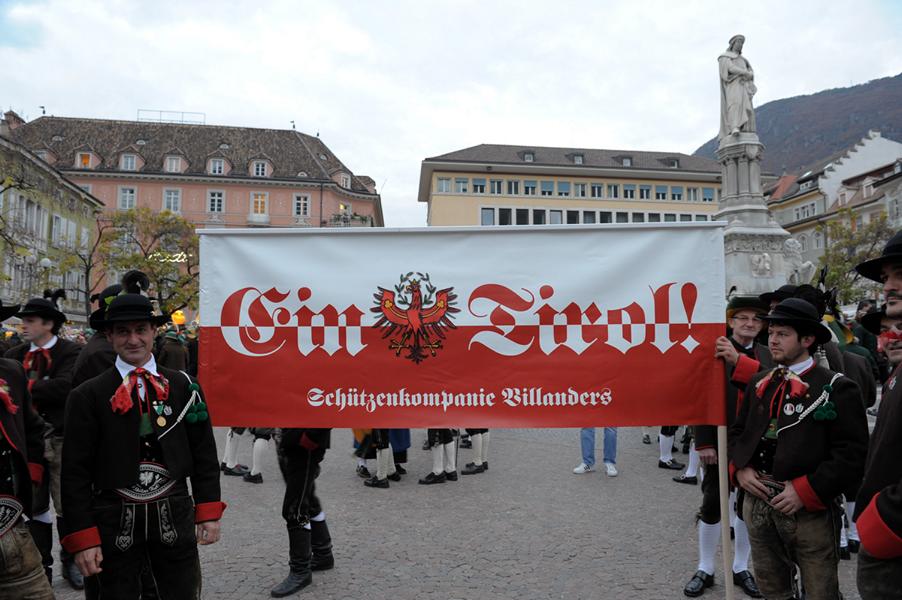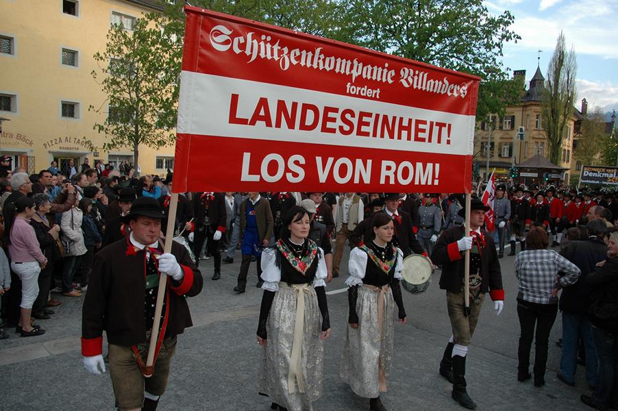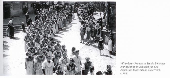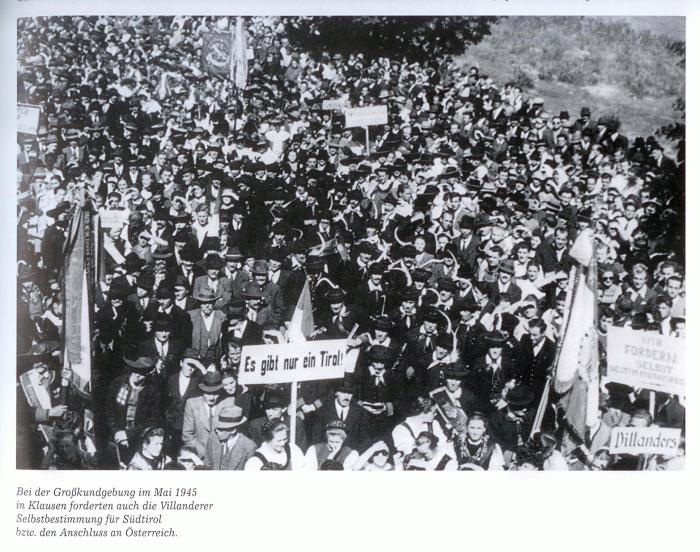 1919 wurde entgegen des Menschenrechts der Selbstbestimmung der südliche Teil Tirols an Italien abgetreten. Durch den Faschismus und die bewusste Italianisierung auch in den darauf folgenden Jahrzehnten wurde das deutsche Volkstum bedroht und bedrängt. Aber durch brüderliche Hilfe und Beistand des Vaterlandes Österreich und des nördlichen Teils Tirols blieb die geistige und kulturelle Einheit des Landes Tirols trotzdem erhalten.