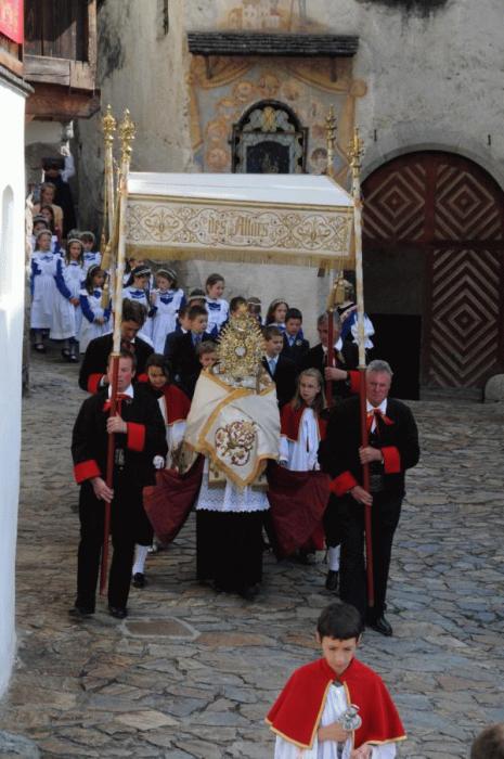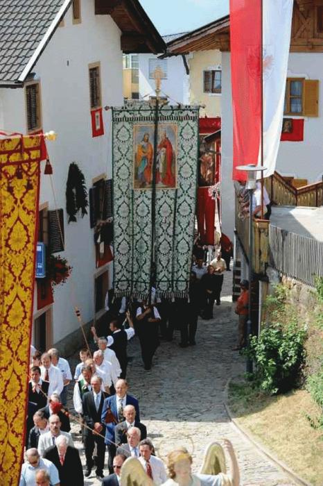 großen Kirchenfahnen werden erhoben und der Traghimmel herbeigebracht. Die noch lebendige Tracht der Villanderer bietet ein farbenfrohes Bild. In der vollbesetzten Pfarrkirche
